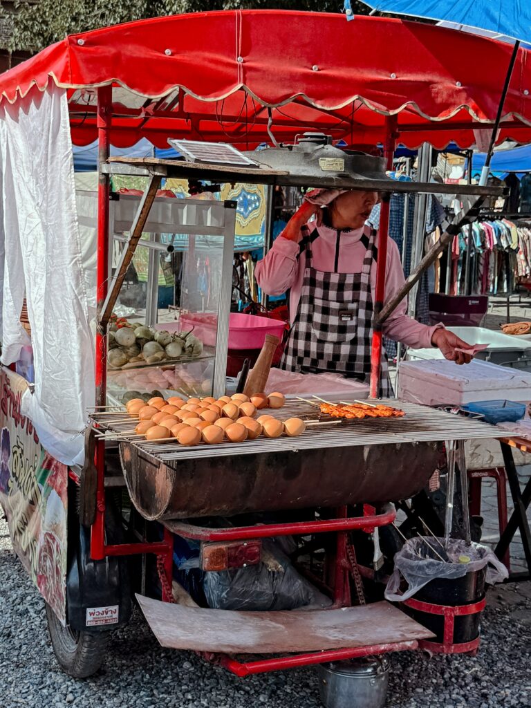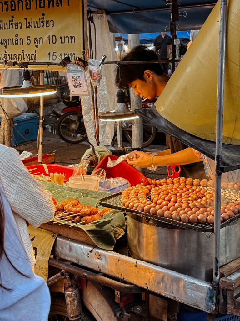 A Chiang Mai, ad esempio, dopo dei succulenti gyoza abbinati a croccanti spiedini, abbiamo provato una sorta di pancake locale realizzato con una cialda sottilissima e croccante con sopra una crema squisita fatta da uova, zucchero e cocco (ndr. scopriamo scrivendo questo articolo che si chiamano “Khanom Bueang”, se volete googlarli). Al mercato sul fiume di Damnoen Saduak, invece, abbiamo scoperto un altro dolce delizioso, comprato solo per l’immenso sorriso che ci ha lanciato la ragazza che li preparava con tanta cura. Questo consisteva in sfere di riso, chicchi di mais, cocco ed erbe (ndr. qui è servito l’aiuto di ChatGPT per risalire al nome di questo dolce, “Khanom Krok”).