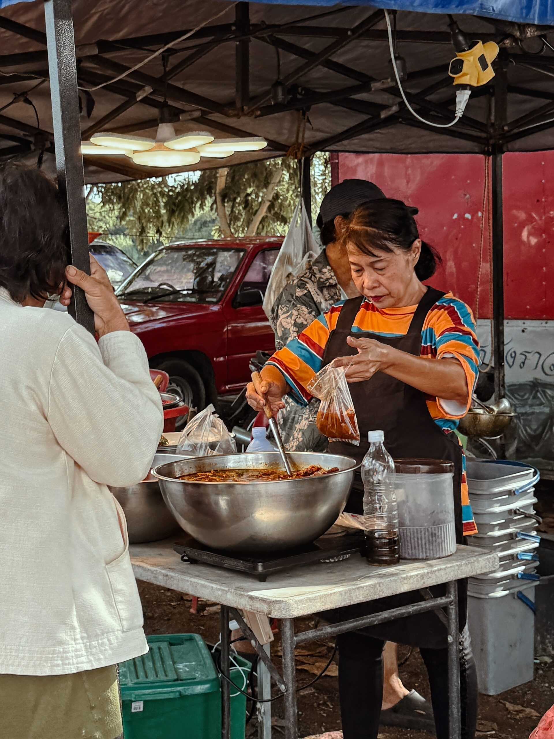 Camminando per strada, ci si accorge subito di quante bancarelle di cibo siano allineate lungo i marciapiedi, incrocio dopo incrocio. Da mattina a sera, spiedini di pollo, zuppe piccanti e noodles ben conditi vengono serviti per strada ai passanti, sia in città che fuori. Prendendo il treno per Chiang Mai, ad esempio, ci siamo accorte in fretta di quanto questa usanza non fosse relegata ai soli centri abitati, ma che bastavano quattro case in mezzo alla campagna per diventare un punto di vendita di street food.